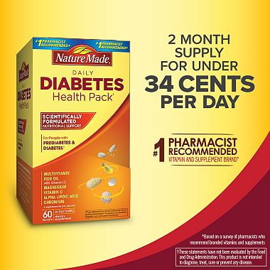 Each pack provides a comprehensive combination of key vitamins, minerals, fish oil and alpha lipoic acid.nature made diabetes health pack is guaranteed to meet our high quality standards. Take over your health and wellness by adding in a dietary supplement. The nature made ® diabetes health pack is scientifically formulated to provide daily nutritional support for people with diabetes or prediabetes and essential nutrients that may be lacking due to the strain diabetes can often put on the body's health. 4.5 out of 5 stars with 20 ratings. Nature made nature made daily diabetes health pack, 60 packets, 60 day supply.